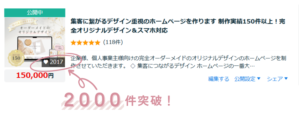 ココナラで出品しているホームページ制作サービスなのですが、お気に入り登録数が2,000を突破しました!