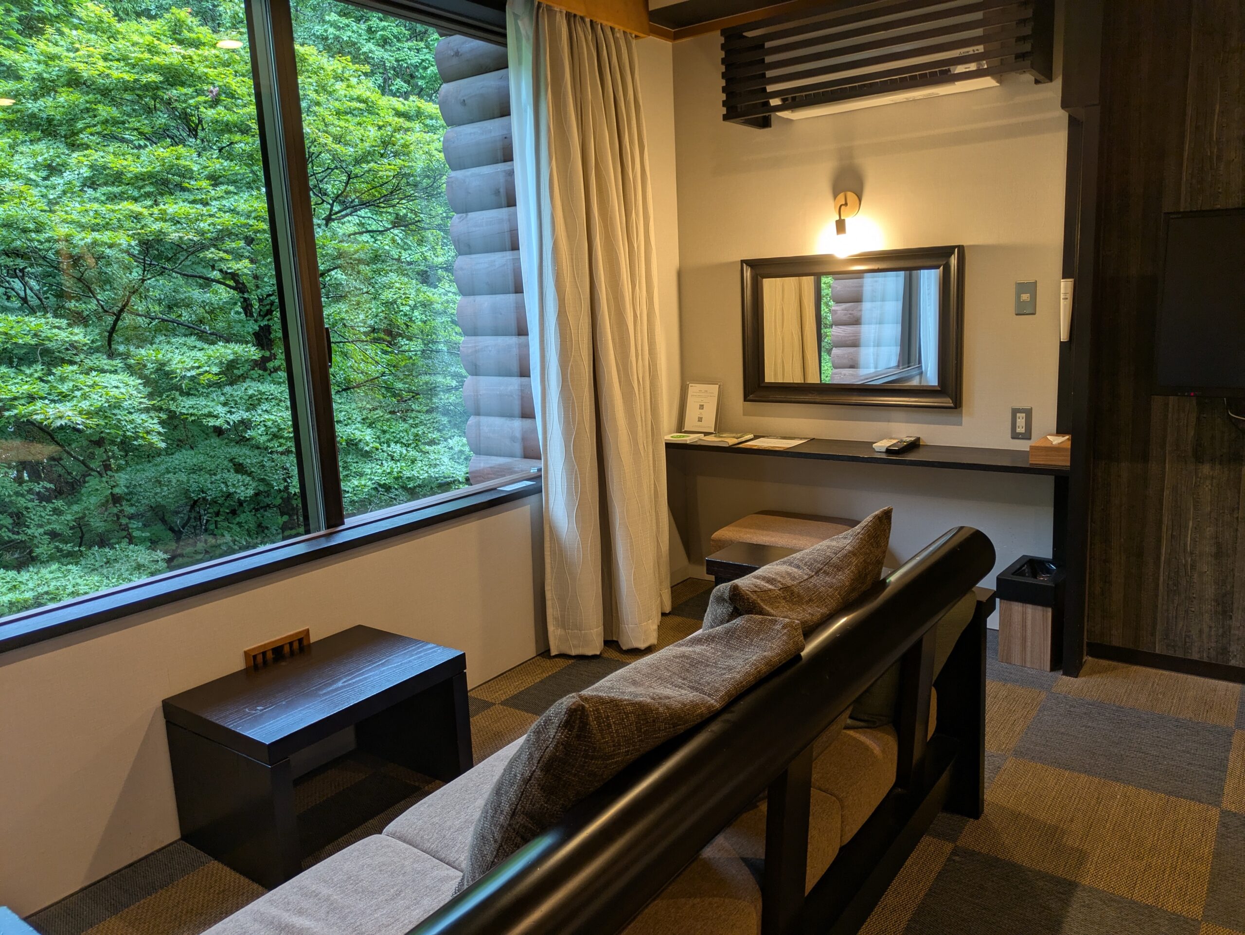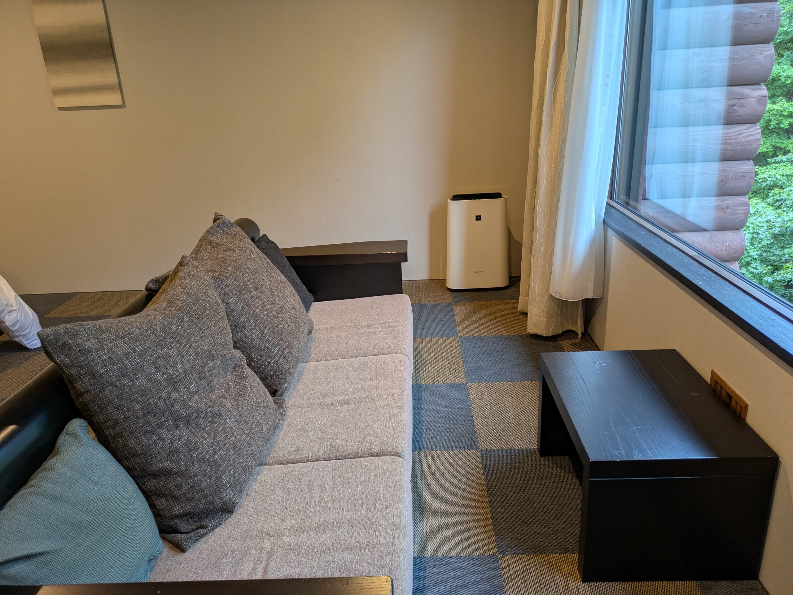 窓に向かってソファが配置されているので、ソファに座ってゆっくり外の緑を楽しむことができますね。ただ、夜は窓に虫が沢山集まっていてすごかったです。窓は開けない方が良いと思いますw