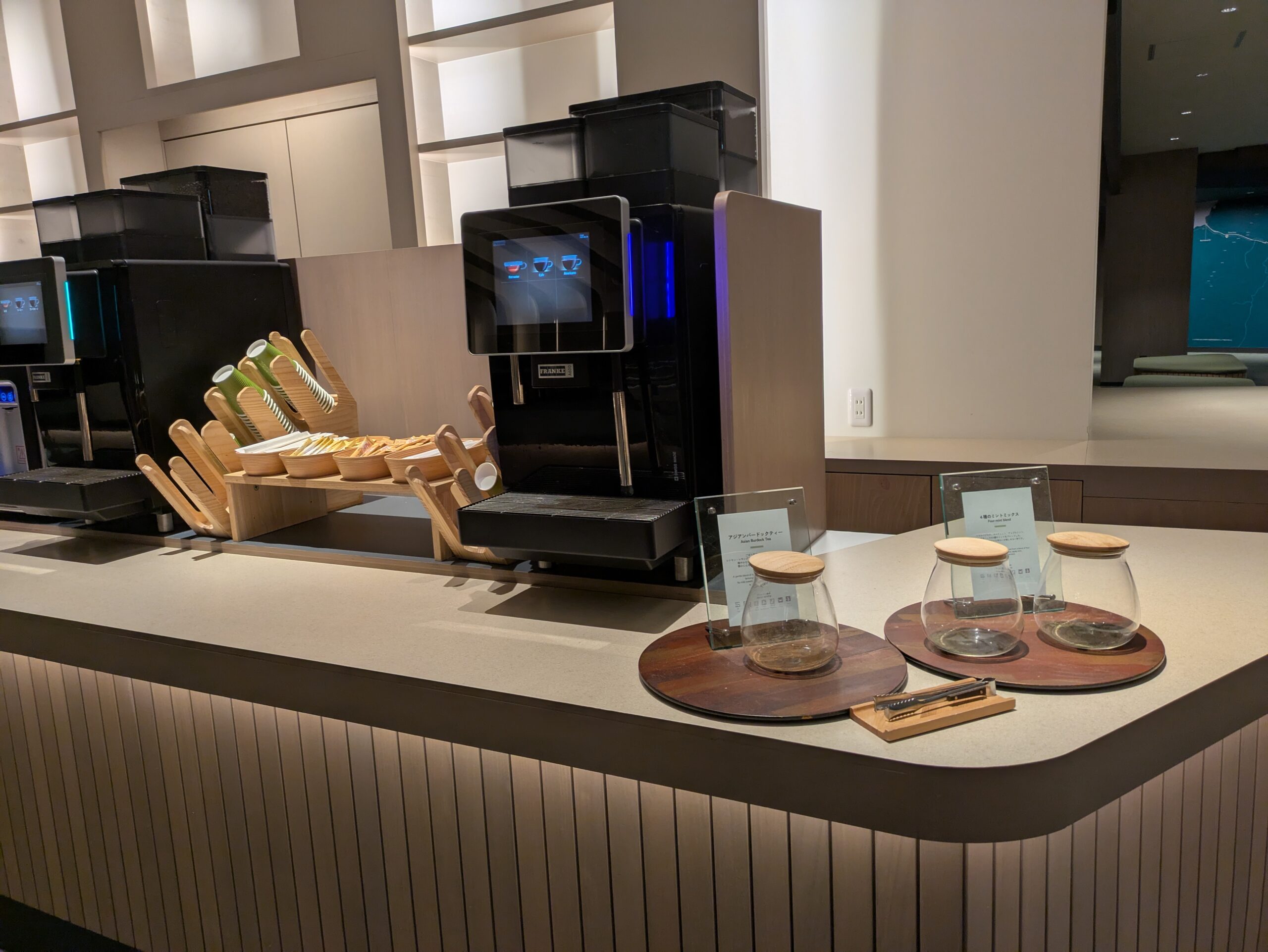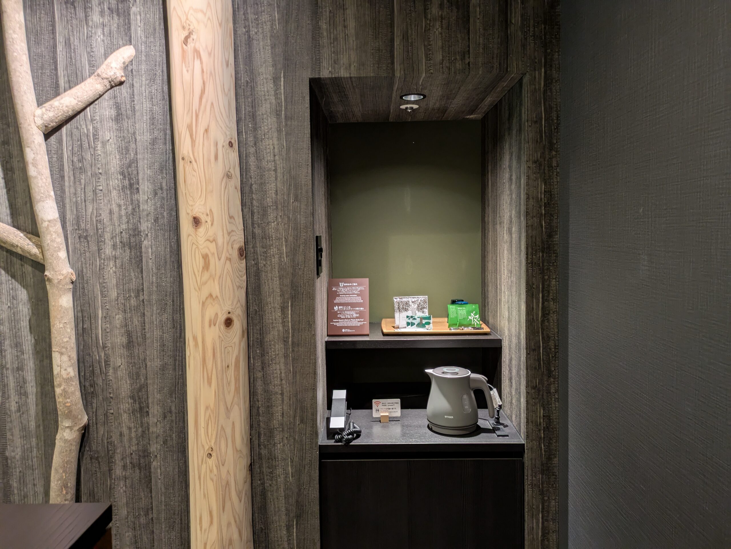 ミニバースペース。無難にコーヒーと緑茶とお茶菓子がおいてありました。