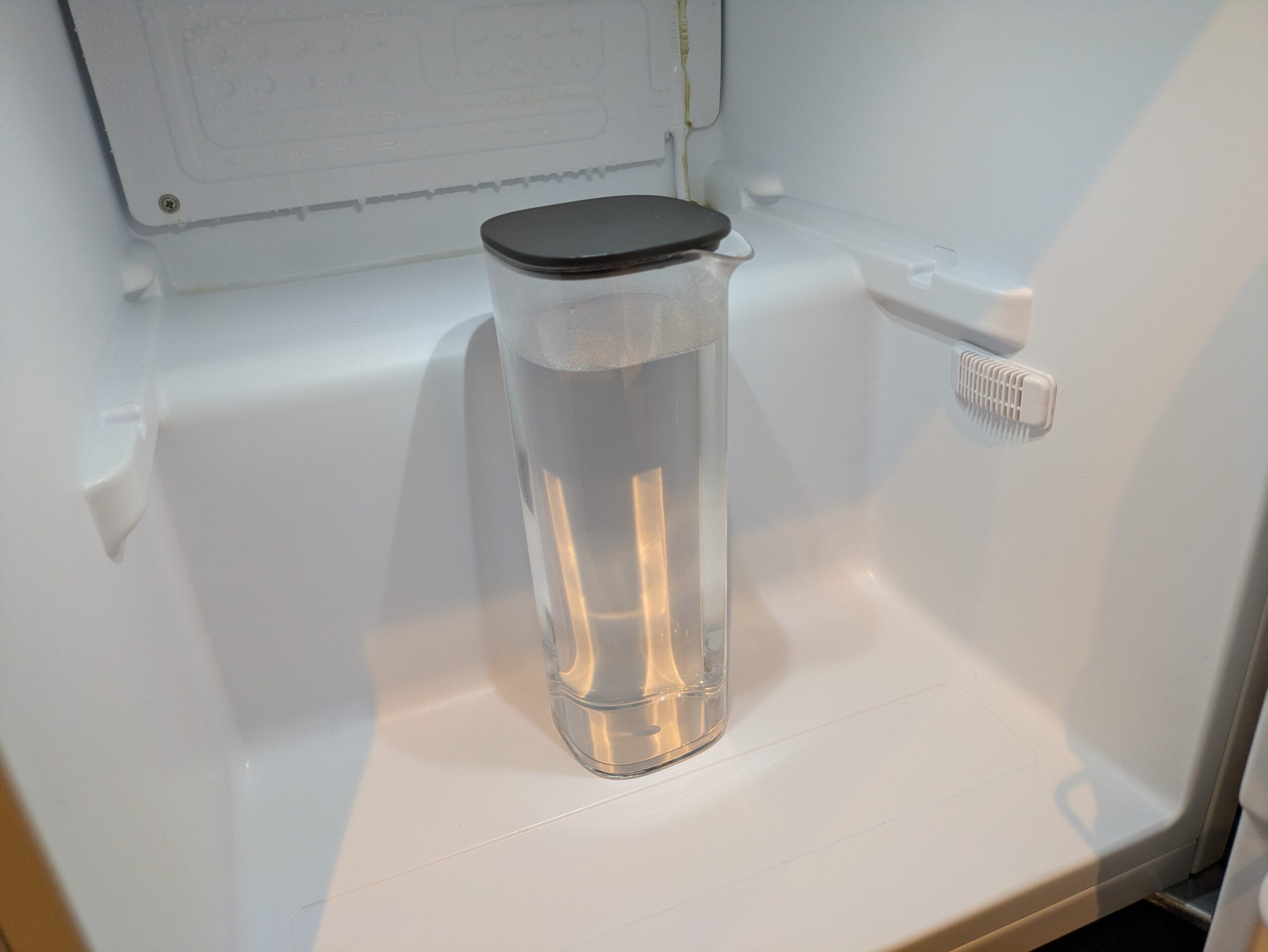 冷蔵庫の中には星野リゾートお決まりの水のピッチャーが。星野リゾートは好きなのですが、このお水のシステムだけは好きになれません。普通にペットボトルのお水を置いておいてほしいです。切実に。