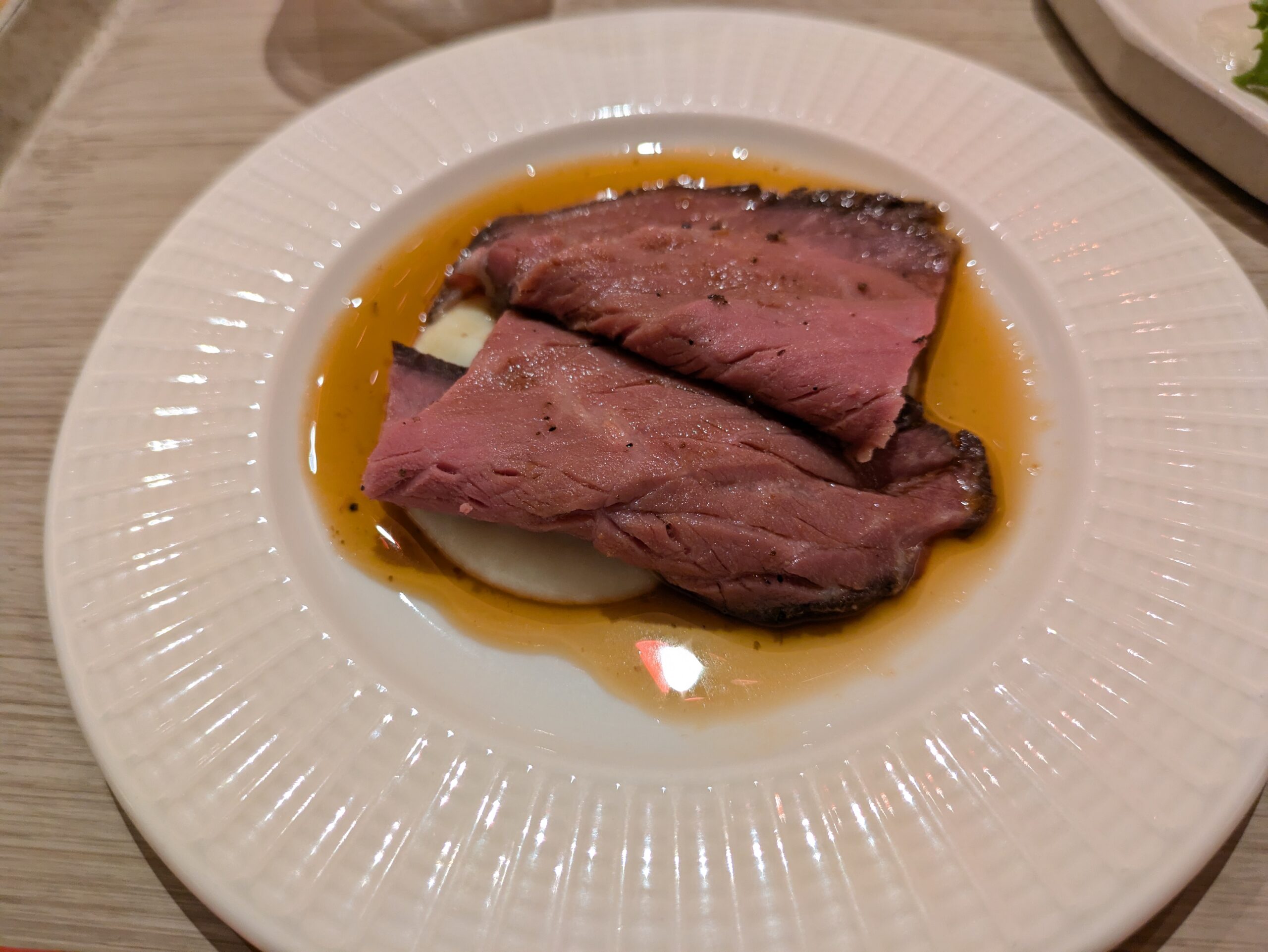 ローストビーフ。肉もやわらかでソースも良い味、付け合わせのマッシュポテトも美味しかったです。