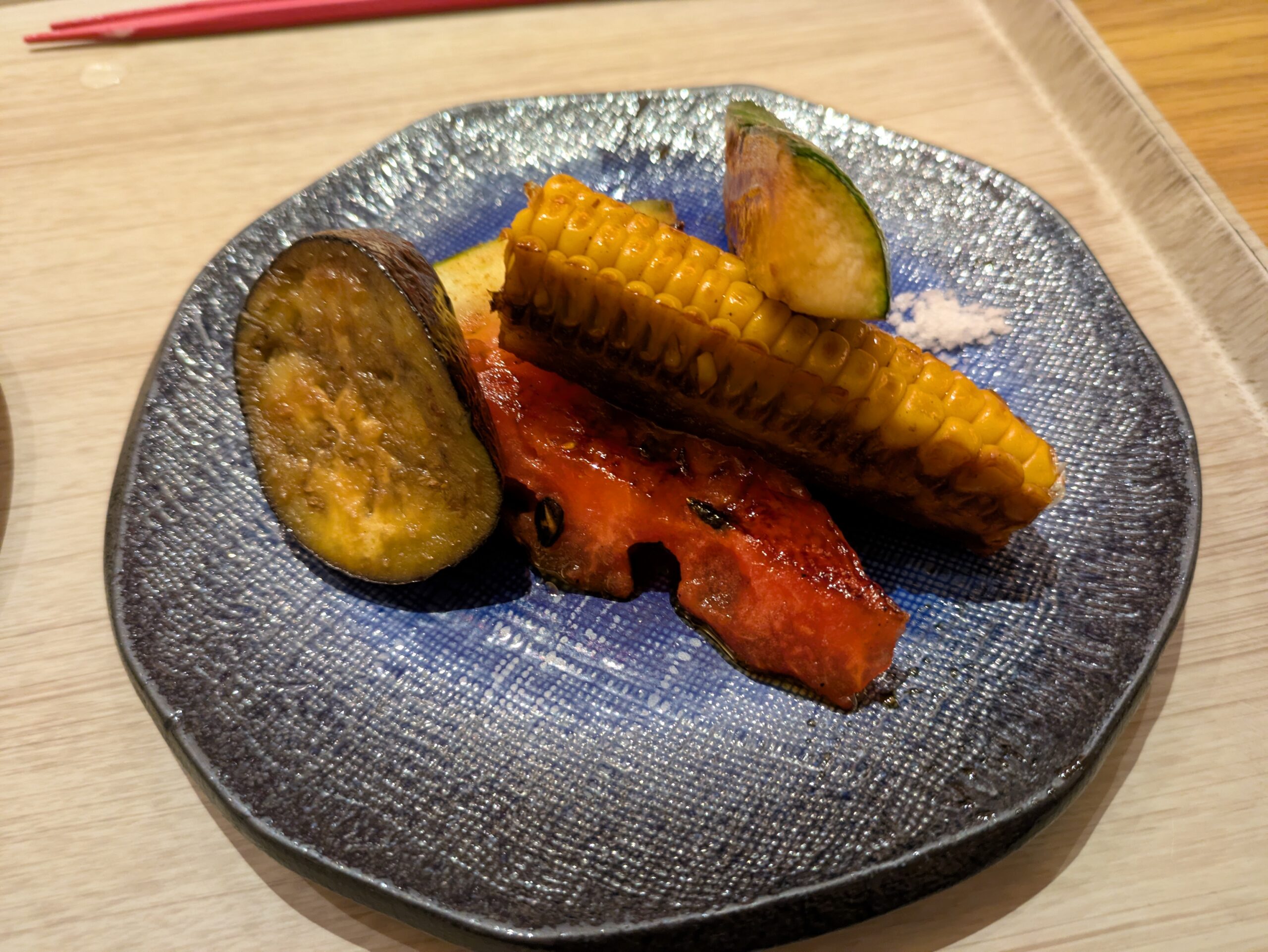 焼き野菜の盛り合わせ。スイカを焼くと甘くなるんですね。